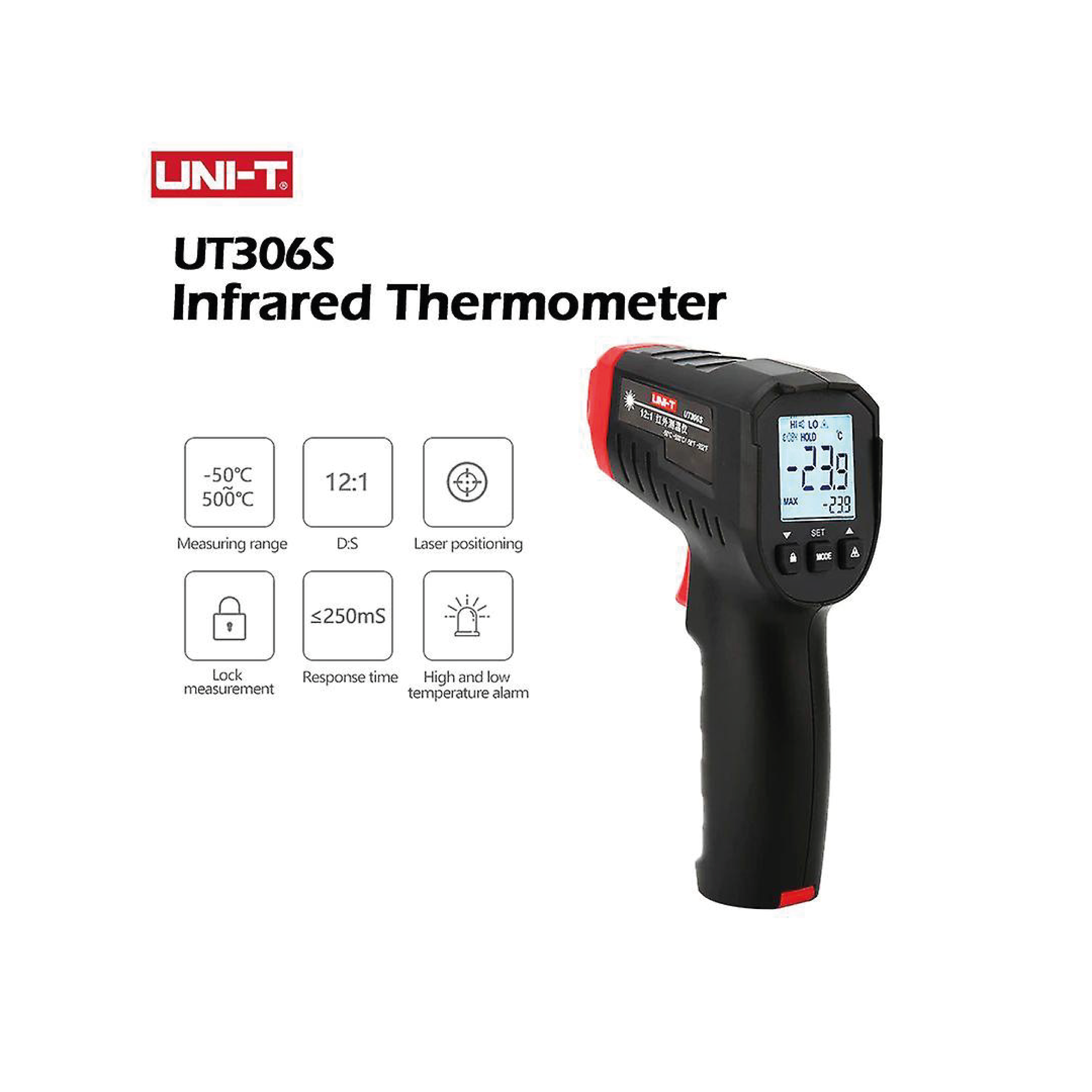 UNI-T UNİT UT306S Kızılötesi Termometre, hızlı ve güvenilir sıcaklık ölçümleri sağlayan bir cihazdır. Bu termometre, temas gerektirmeden yüzey sıcaklıklarını ölçmek için kızılötesi teknoloji kullanır, bu da hijyenik ve pratik bir çözüm sunar. Özellikle endüstriyel ve ev kullanımları için idealdir. Bu ürün, sıcaklık ölçümlerinizde güvenilir ve hızlı sonuçlar almanızı sağlar ve çeşitli uygulama alanlarında kullanımı oldukça pratiktir.